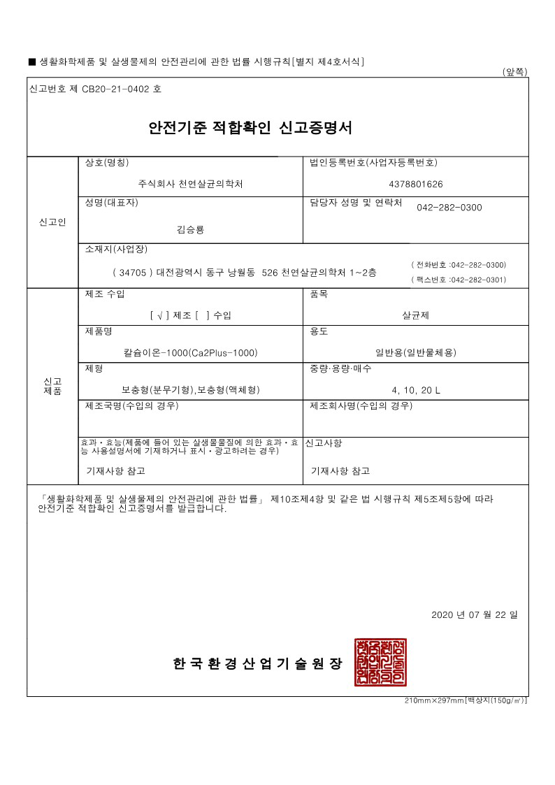 [안전기준적합확인신고증명서]칼슘이온1000... Info. 글쓴이 관리자 Date 21-06-30 23:00 조회194 댓글1 Link 이전 다음 목록 Content [안전기준적합확인신고증명서]칼슘이온1000(Ca2Plus1000) 이전 다음 목록