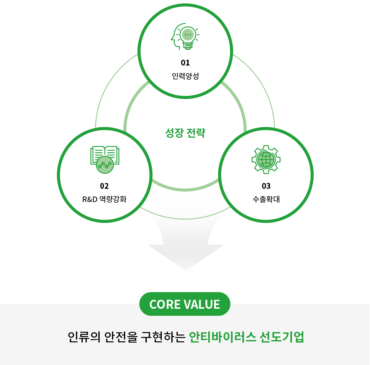 는 인류를 끊임없이 공격하고 있는 변종바이러스에 대응하기 위해 신제품을 개발하고 안티바이러스 시스템을 연구하고 있습니다. 기업부설연구소는 R&D 역량을 강화시키기 위해 연구 인프라를 확장하고 산학협력기관과 협업하여 고급 인력을 육성하며 세계 속 K방역의 우수함을 전파하고 있습니다.